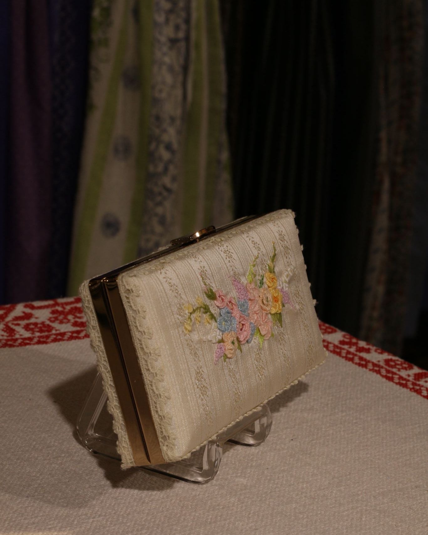 A delicate clutch bag handcrafted from fine satin, embroidered with soft pastel florals — and paired with a matching headband.